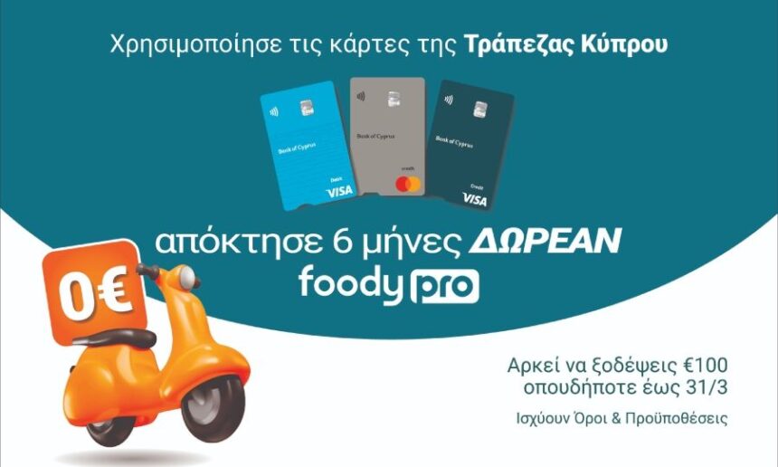 Μια νέα συνεργασία μεταξύ της Τράπεζας Κύπρου και του Foody φέρνει σημαντικά προνόμια για τους καταναλωτές κατά τον μήνα Μάρτιο. Οι κάτοχοι καρτών της Τράπεζας Κύπρου μπορούν πλέον να αποκτήσουν δωρεάν συνδρομή Foody Pro για έξι μήνες, μετατρέποντας τις καθημερινές τους αγορές σε ευκαιρία για εξοικονόμηση.